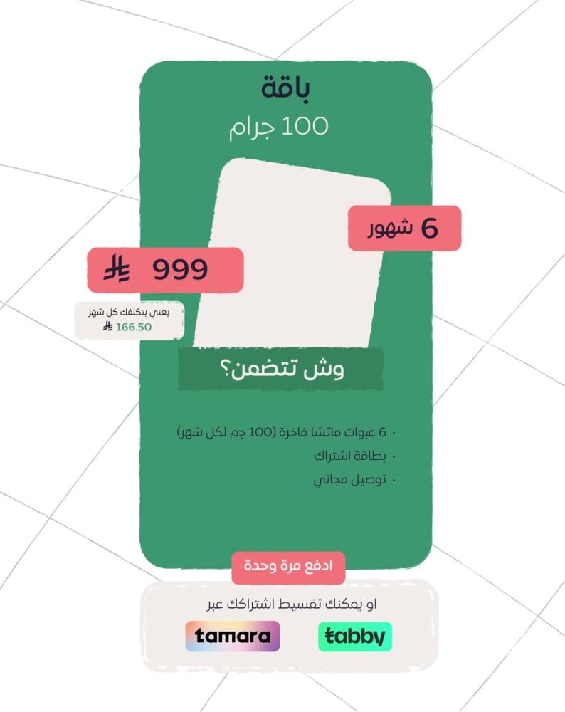 نظام موماتشا بلس الذكي — خدمة اشتراك شهرية توفر لك منتجات الماتشا الفاخرة والأدوات المخصصة لتحضيرها، مع توصيل مجاني إلى باب منزلك داخل المملكة العربية السعودية.
